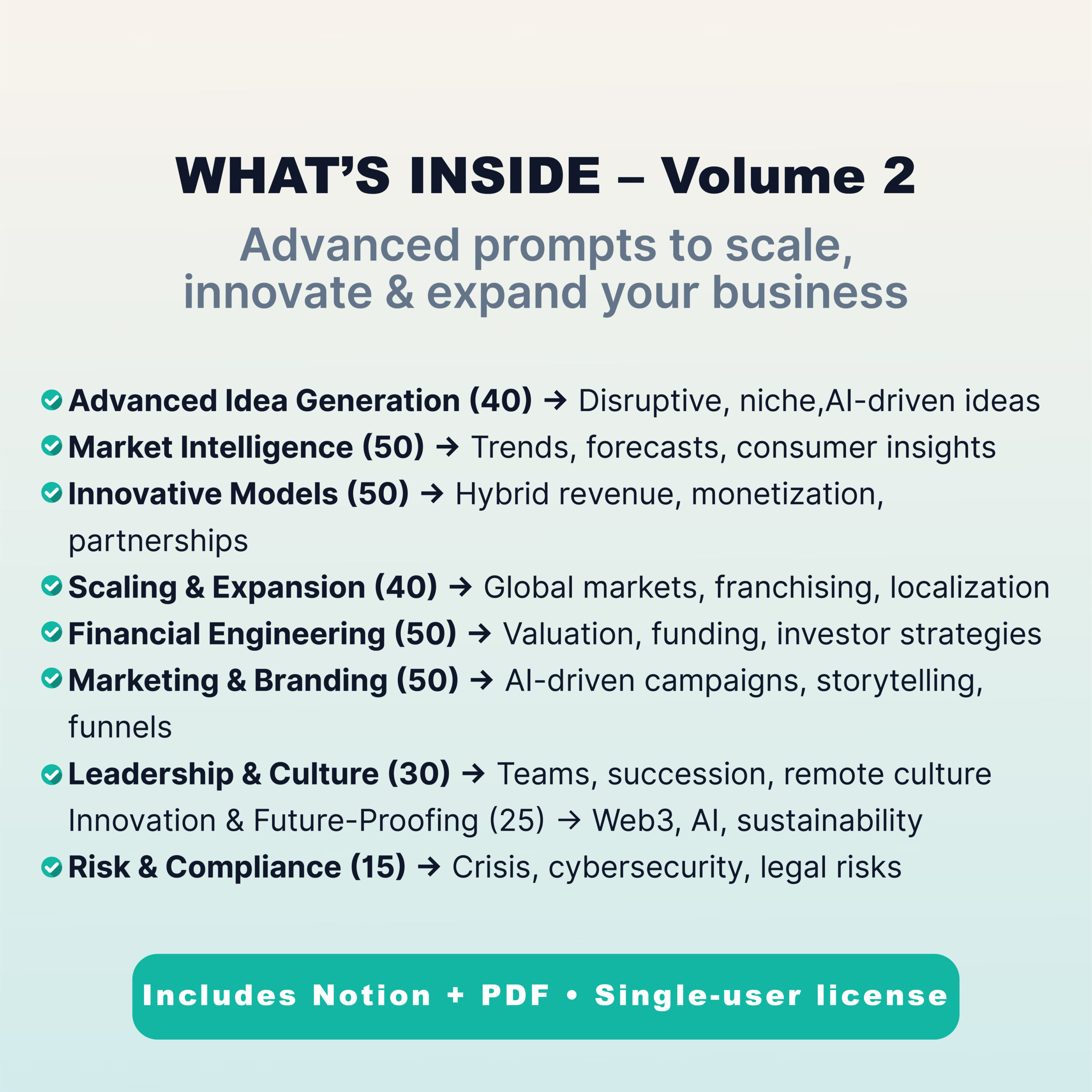 Volume 2 goes beyond the basics, focusing on growth strategies, investor readiness, disruptive innovation, and global expansion. Perfect for business owners who already have the foundations and want to unlock advanced strategies.