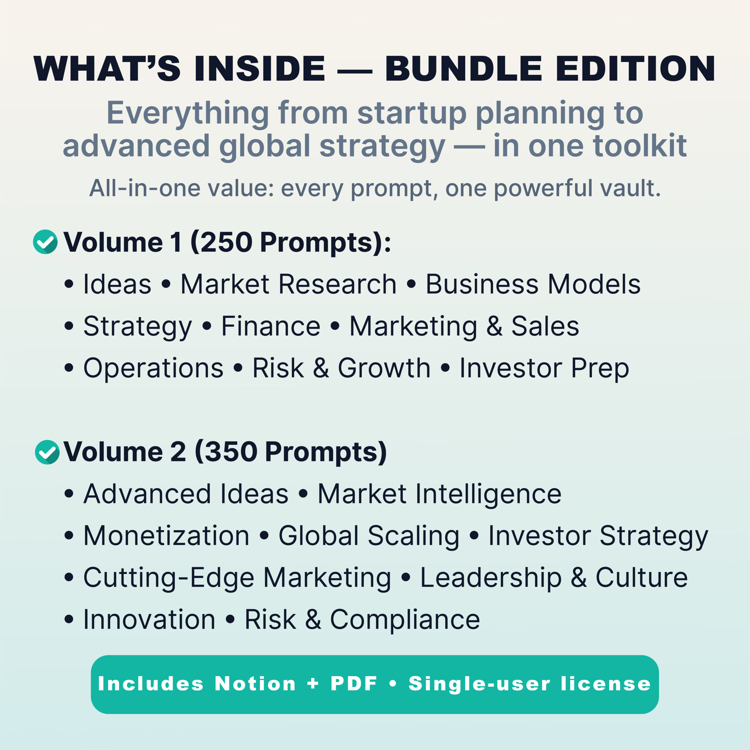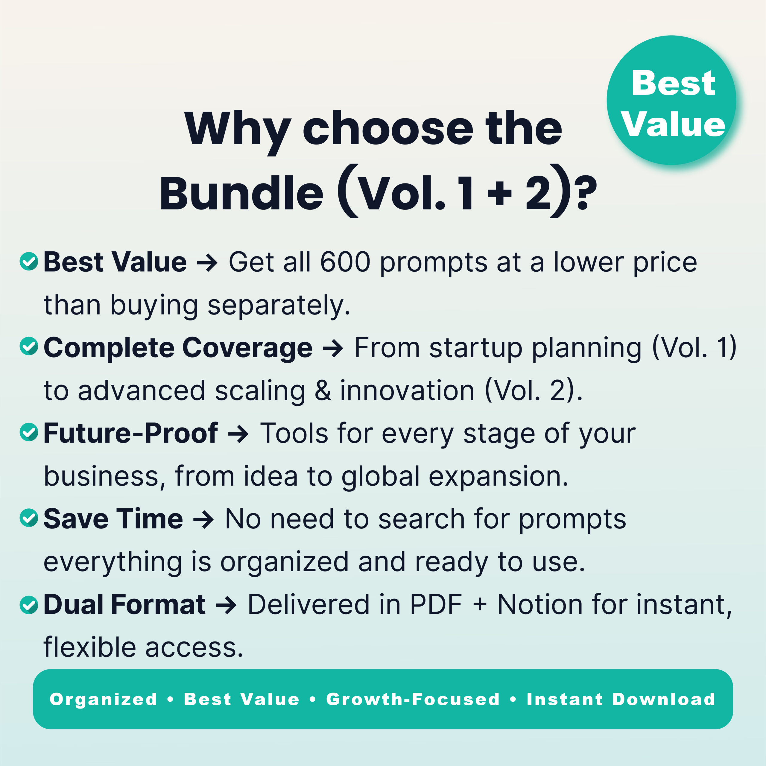 + Free ShippingGet the complete Business Plan & Strategy Prompt Vault Bundle – combining Volume 1 (250 prompts) and Volume 2 (350 prompts) for a total of 600 AI prompts.