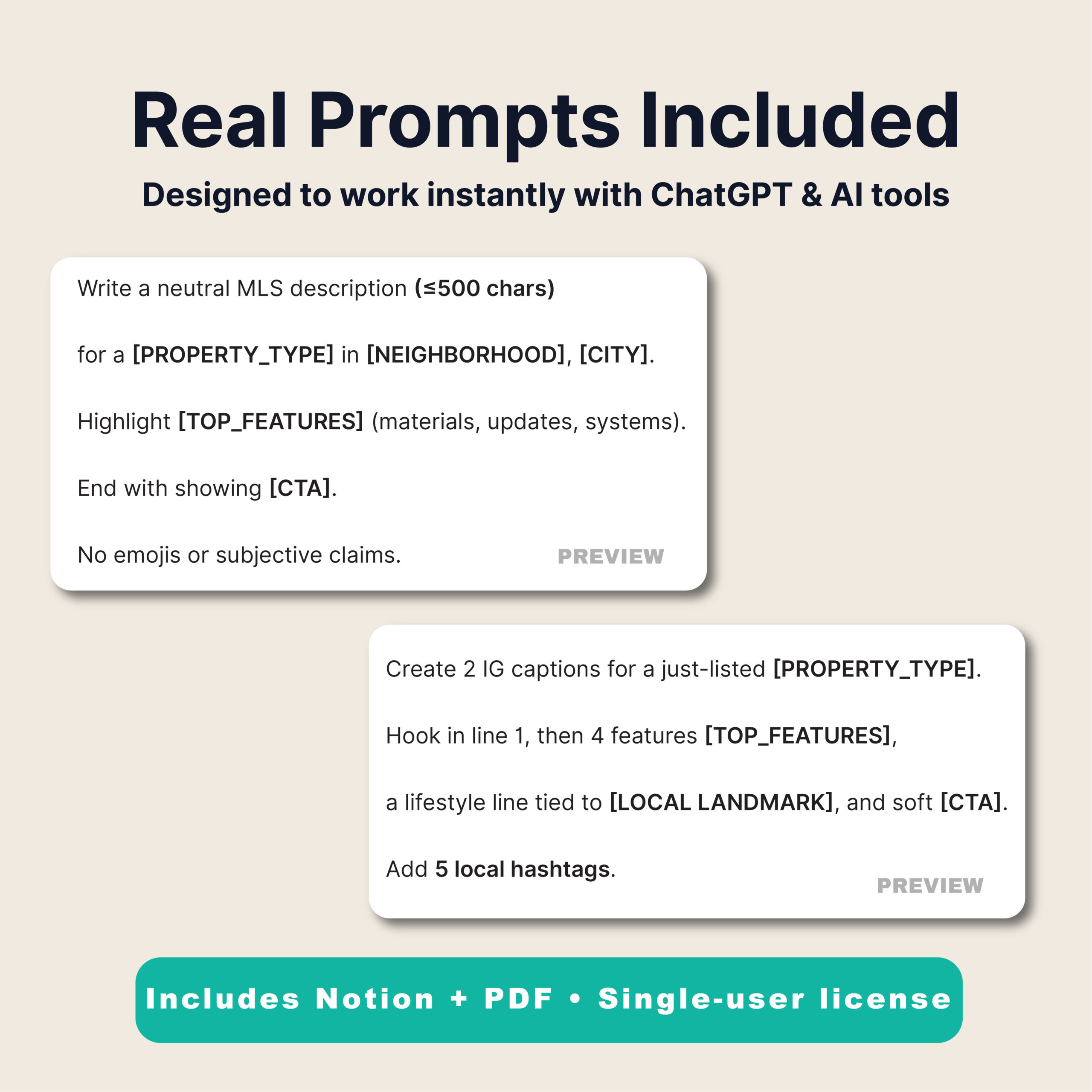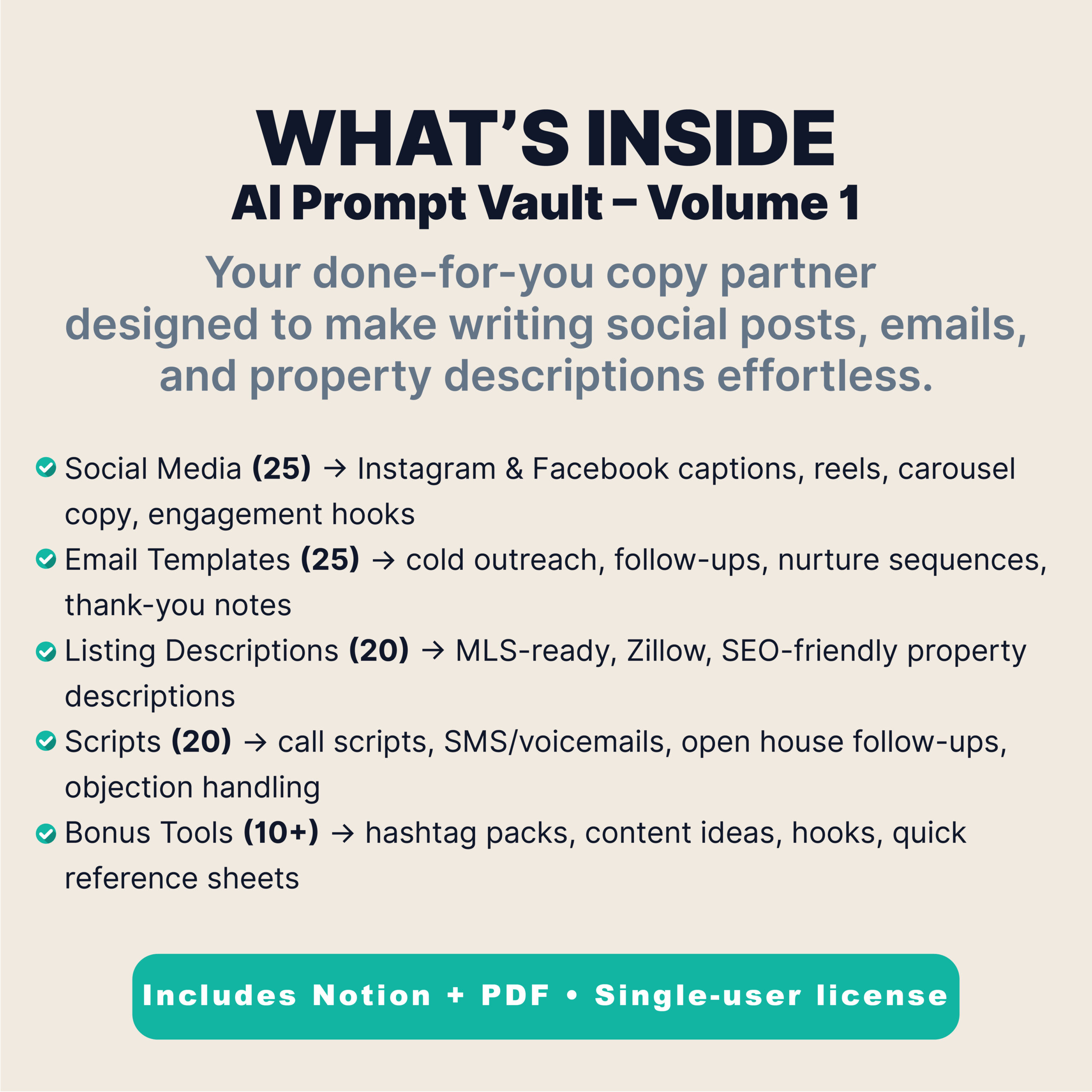 Residential Agent Prompt Vault (Vol. 1) — 100+ AI Prompts for Listings, Emails, Social Media & Scripts